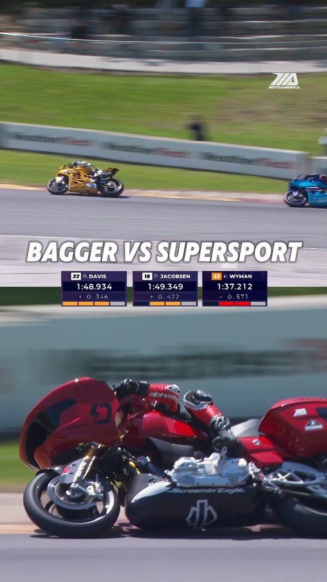 .@KyleWyman shows us just how fast the @MissionFoodsUS King Of The Baggers bikes go compared with two of Supersport's top riders, @PJ99Jacobsen and Blake Davis ⏱️ 🔥