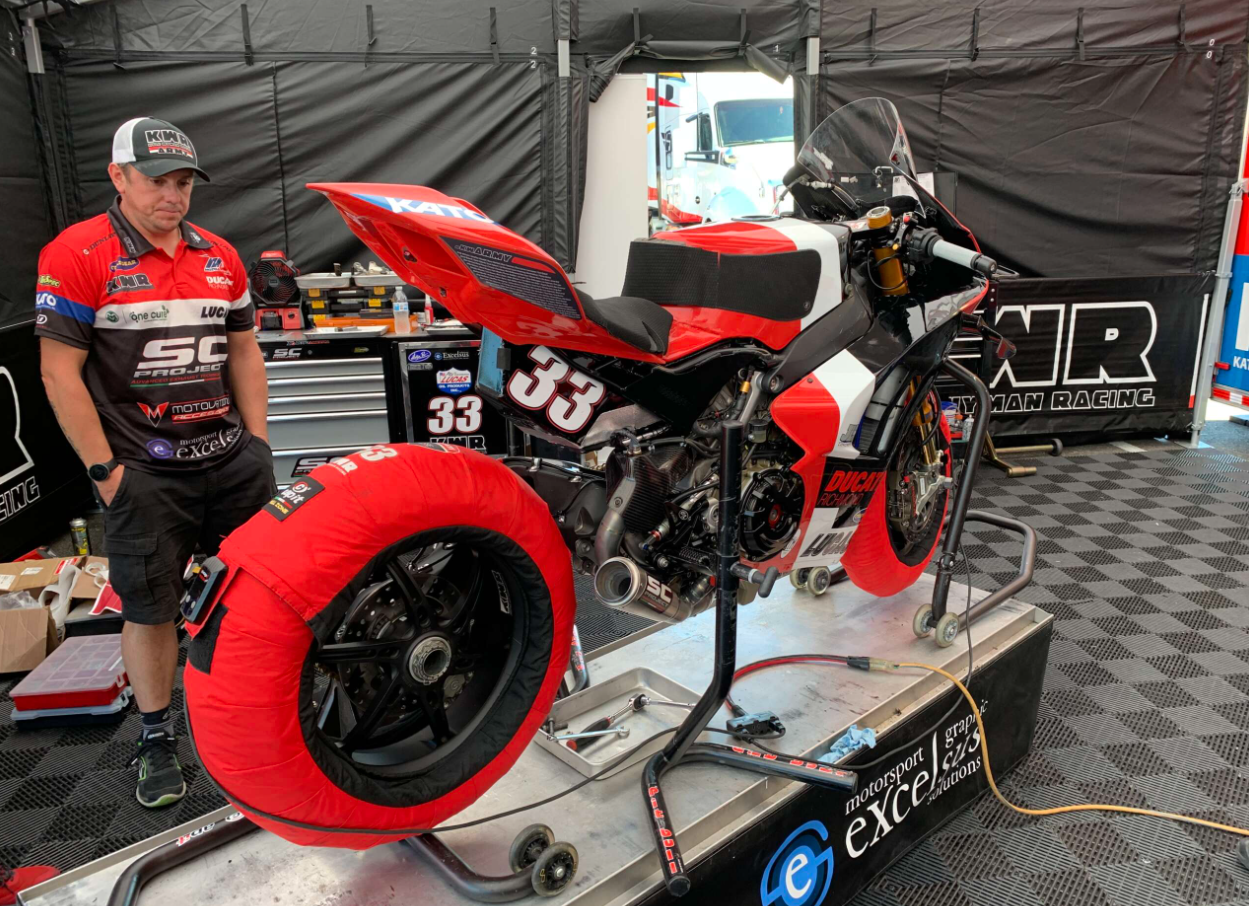 After Kyle Wyman’s unfortunate crash during the very first practice session of the day at the Official Dunlop MotoAmerica Test, held on Thursday prior to the start of round five of the MotoAmerica HONOS Superbike Championship at the Ridge Motorsports Park, he and his Ducati Richmond/KWR Ducati Team went straight to work rebuilding his Superbike, which had essentially split in half from impacting the ground.