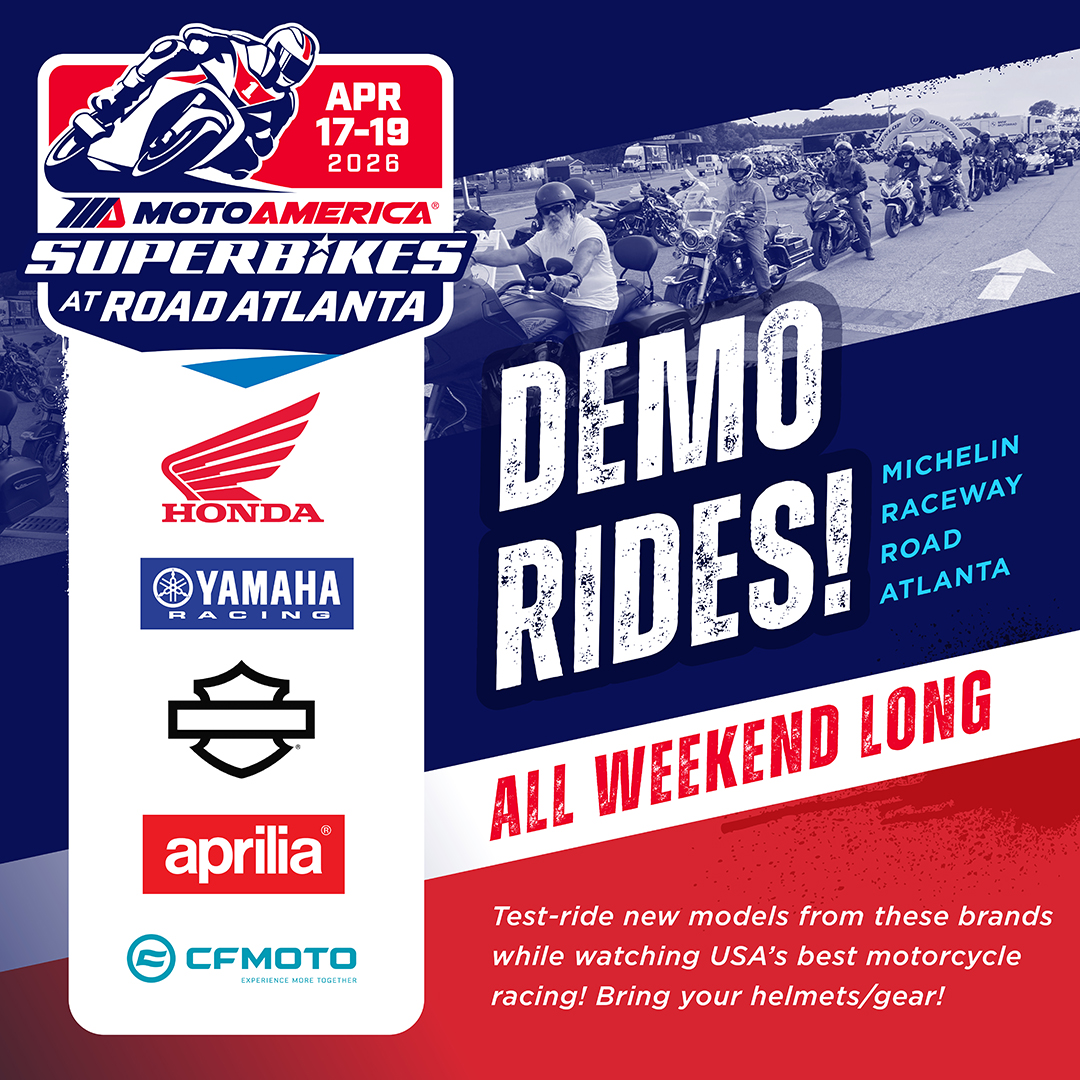 Bring your riding gear! Don’t miss free motorcycle demo rides with paid admission at MotoAmerica Superbikes at Road Atlanta, April 17-19. Test ride bikes from Honda, Yamaha, Harley-Davidson, Aprilia and CF MOTO. Get your tickets to watch all-weekend racing across 6 classes including Superbikes, Mission King Of The Baggers and more.