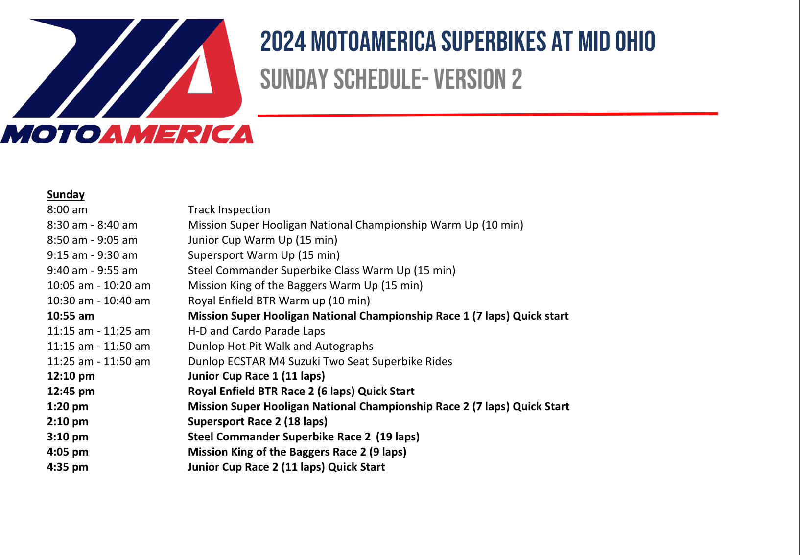 Due to rain on Saturday, two of MotoAmerica’s six classes that are racing at Mid-Ohio Sports Car Course had to be postponed till Sunday. So, get ready for a blockbuster day with eight, count ’em, eight races, including two Junior Cup races and two Mission Super Hooligan National Championship races to go along with the encore races in Steel Commander Superbike, Mission King Of The Baggers, Supersport, and Royal Enfield Build. Train Race.