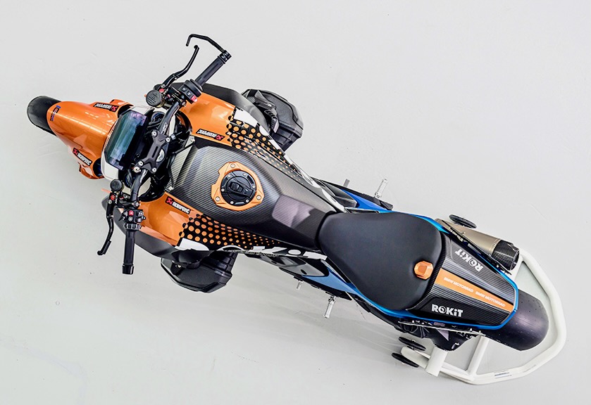 The bike bristles with high-end eye candy, including a wide range of lightweight, high-strength carbon fiber components from both the BMW Motorrad program and Ilmberger Carbonparts, as well as fully adjustable hand levers from Advik; a lightweight, titanium exhaust system with carbon silencer from Akrapovič; and milled BMW Motorrad footrests.