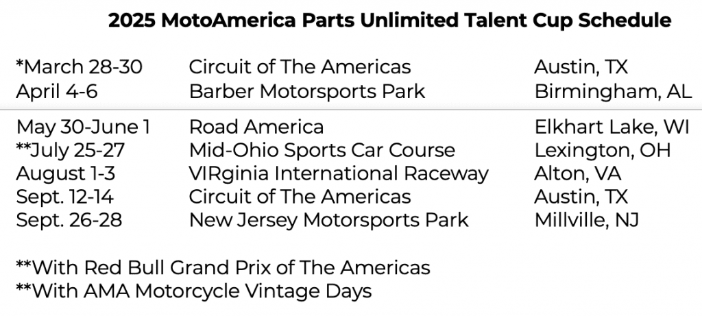 “MotoAmerica’s relationship with Parts Unlimited goes back to the very beginning of our series,” said MotoAmerica President Wayne Rainey. “We’re excited to create a new path for young racers that puts them on the Road to MotoGP with Parts Unlimited’s help. It’s great that they want to support the Talent Cup. We’re looking forward to getting to COTA in March and seeing the debut of the new class as the 2025 season should be the best yet.”