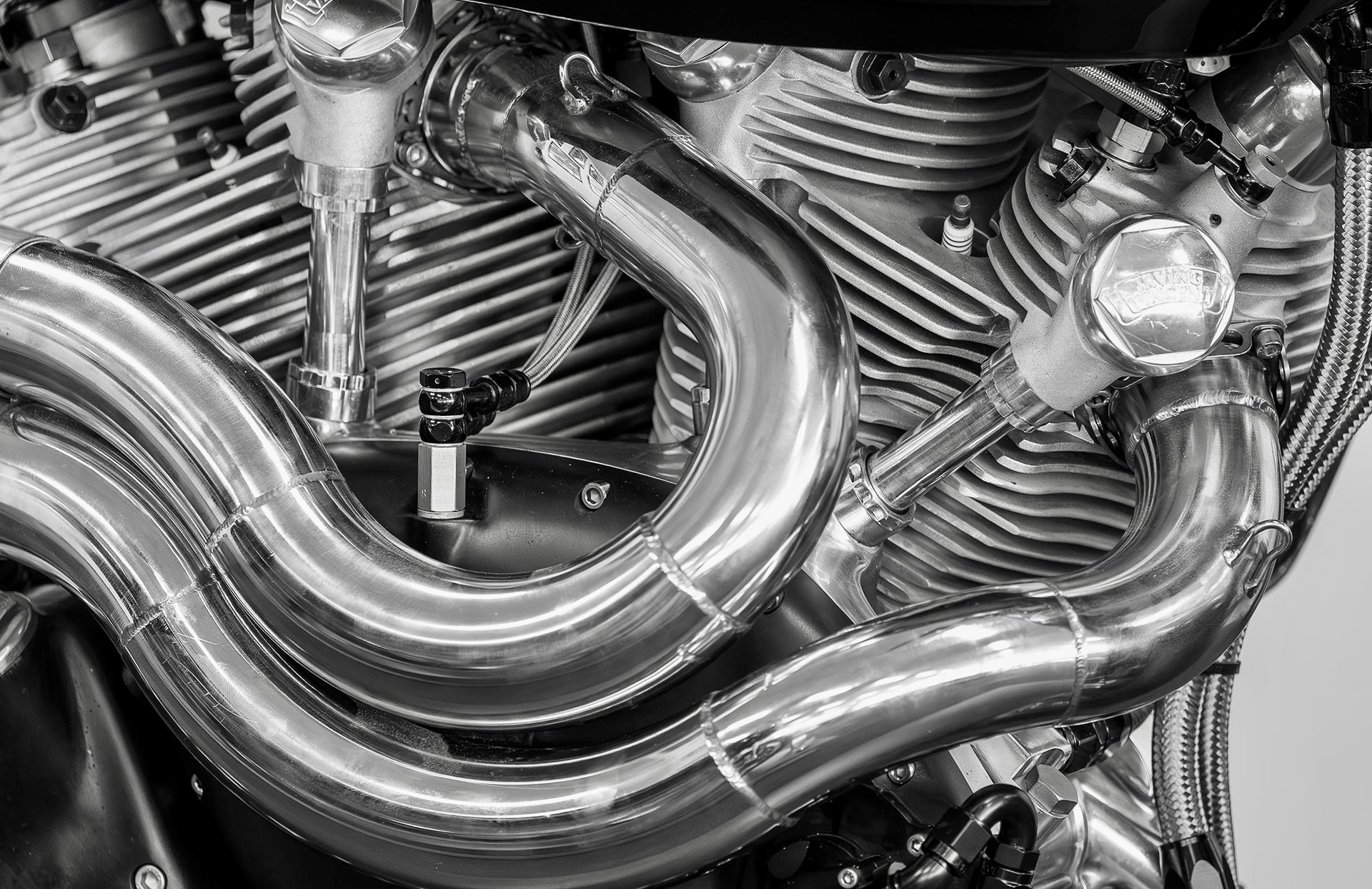 To start with, the Irving Vincent 1622cc Super Hooligan bike features Carrillo steel connecting rods and Nikasil-bore cylinders filled with full-skirt, three-ring, flat-top pistons that are designed in-house by the Horner brothers and custom-made by JE Pistons in California.